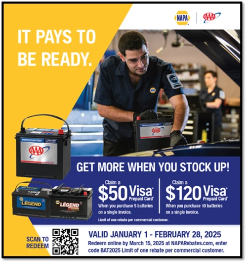 From January 1 – February 28, 2025, NAPA is offering battery installers including AAA service providers, opportunity to an earn a Visa® prepaid card with a qualifying purchase of AAA branded and NAPA Legend batteries. Specifically shops can earn a $50 Visa card for the purchase of 5 batteries on a single invoice, or $120 Visa card for 10 batteries on a single invoice. Limit one rebate per commercial customer.