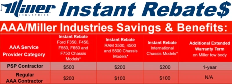 * Instant rebate only applies to new Ford F350, F450, F550, F650 and F750, new RAM 3500, 4500 and 5500 models and new International models purchased through an authorized Miller Industries Distributor in the USA. Note: Although most do, some Miller Industries distributors do not source their Ford, Ram or International chassis models through Miller Industries and as a result, these vehicles would not be eligible for the Ford, Ram or International cash-back rebate. AAA clubs and service providers are encouraged to confirm Ford, Ram, International cash-back rebate eligibility with their local Miller Industries distributor prior to agreeing on the purchase price. Ford, Ram, International cash-back rebate /Miller extended warranty/parts discount card must be issued to the purchaser exactly as listed on the sales agreement. Parts discount card only remains active as long as purchaser remains affiliated with AAA.